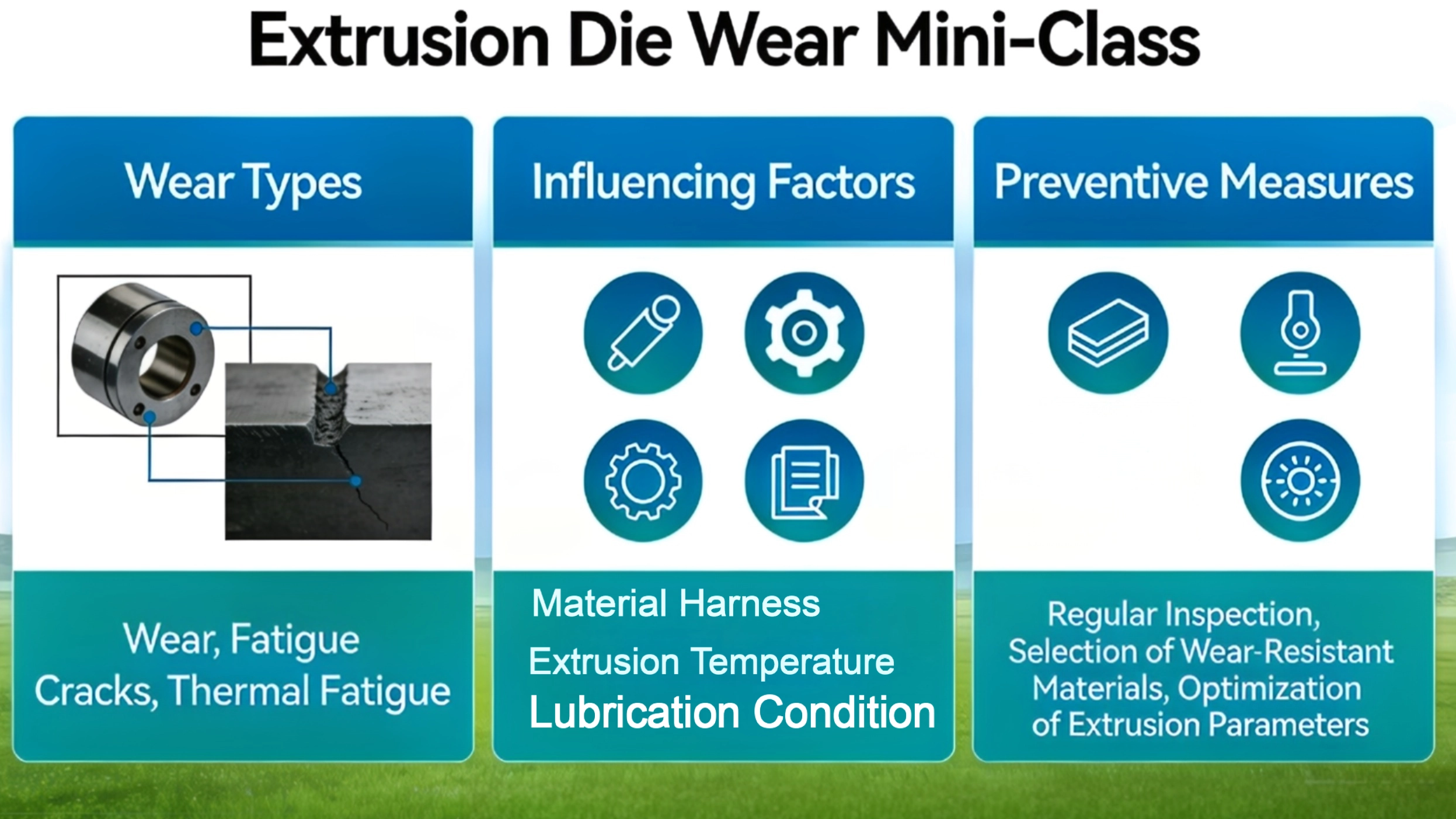 The failure modes of extrusion dies mainly include three normal failure types: wear, cracking and deformation. Additionally, premature failures may occur due to improper operation or nitriding quality issues.